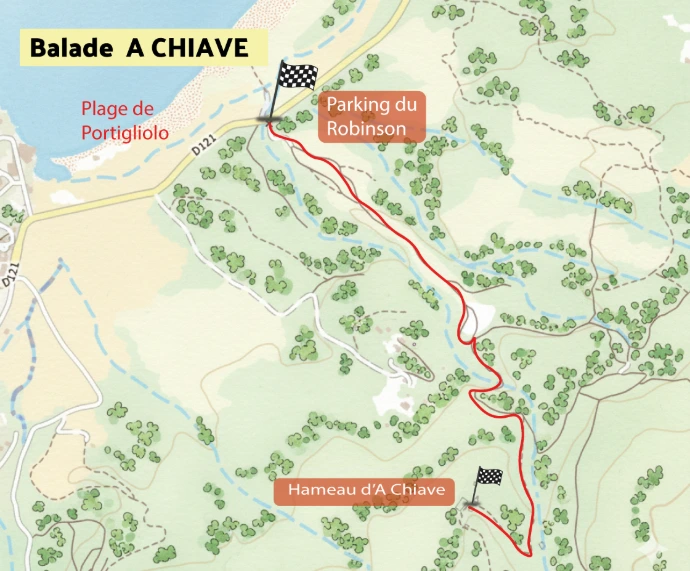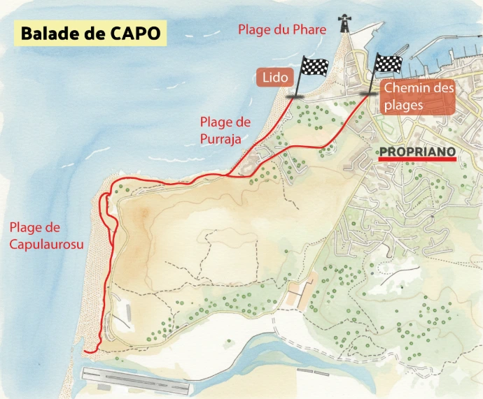 Le départ se fait depuis le parking de la plage de Cupabia. Rejoignez la plage, puis dirigez-vous vers la gauche, jusqu’à son extrémité, où débute le sentier à travers le maquis.
